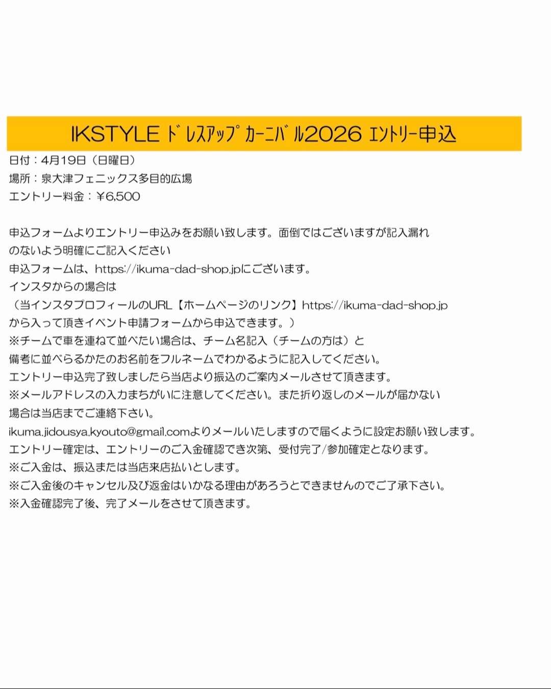 またチームの方同士で車を連ねて並べたい場合は、チーム名の記入と備考に並べられるかたのお名前をフルネームでわかるように記載お願いいたします。